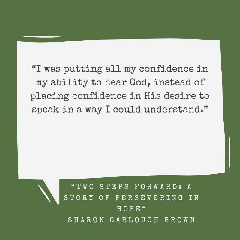 I was reading a Christian fiction novel “Two Steps Forward: A Story of Persevering in Hope” by Sharon Garlough Brown. One of the main characters writes in her journal about her struggles with discernment. What she realizes is that she was putting her confidence in her own ability to hear God and not in God’s desire to speak to her in a way she could understand. This particularly caught my eye because lately I have been discerning my next steps. I feel God is drawing me to a new chapter in my life but I’m uncertain as to what it is. When I pray, I am so focused on trying to hear God speak to me that I fail to acknowledge He desires to guide and direct me. It’s not my ability to hear Him but it’s His ability to show me in a way that I understand it.