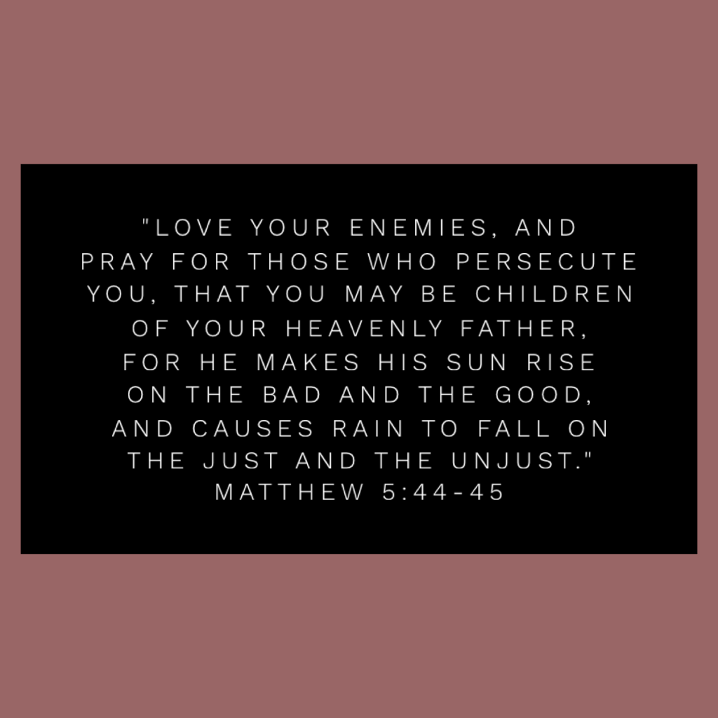 “Love your enemies, and pray for those who persecute you, that you may be children of your heavenly Father, for he makes his sun rise on the bad and the good, and causes rain to fall on the just and the unjust.”